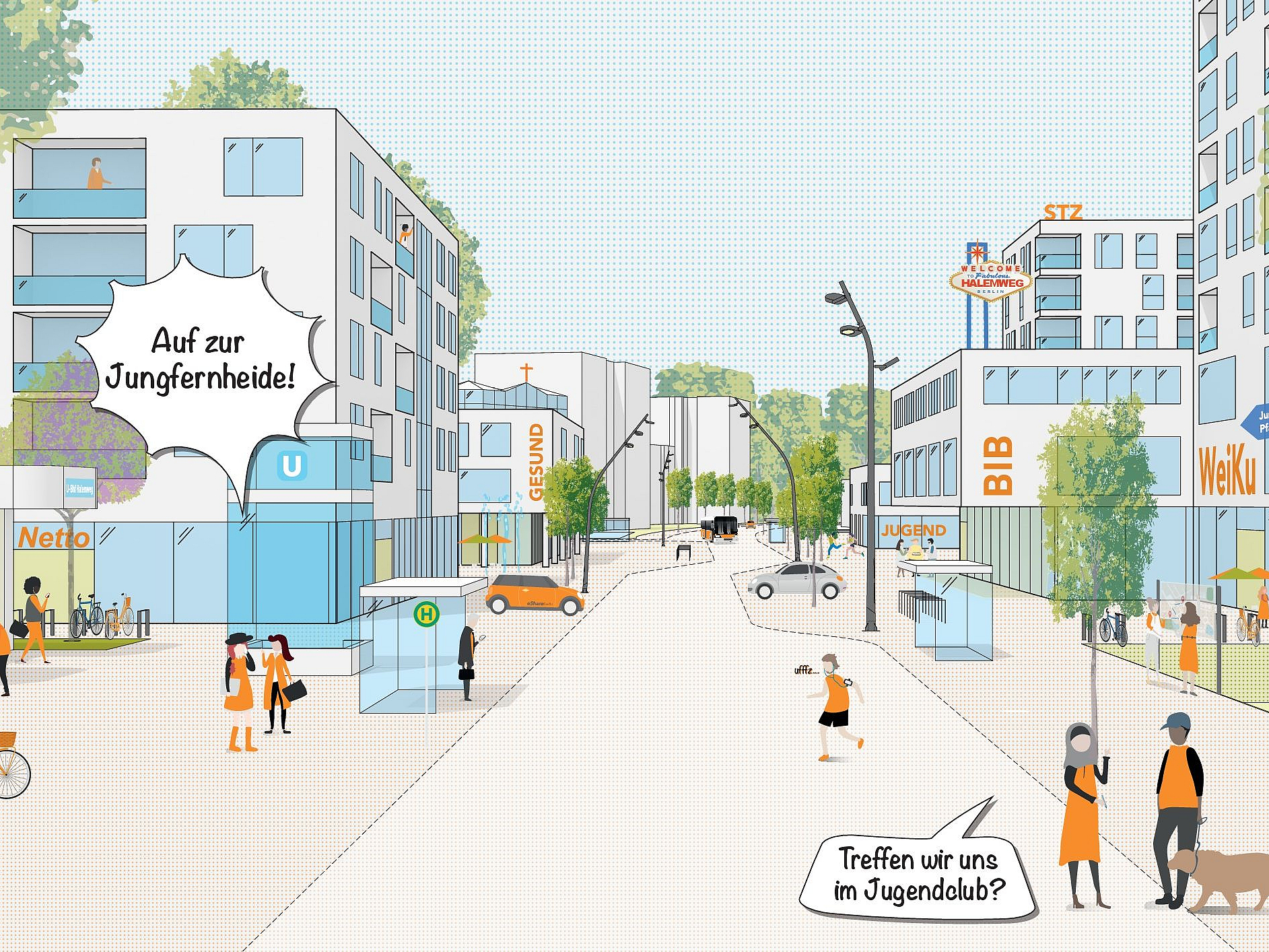 Nach dem Leitbild „Urbanität light“ konzentrieren sich die Einrichtungen der öffentlichen Infrastruktur entlang des verkehrsberuhigten Halemwegs mit einzelnen Hochpunkten. Öffentliche Einrichtungen, wie das neue Bildungs- und Kulturzentrum mit Stadtteilbibliothek, Kiezgalerie, Kunstgarten, Musik- und Volkshochschule, das Stadtteilzentrum sowie Einkaufsmöglichkeiten bilden vielfach den Sockel für darüber liegende Wohnnutzungen. Auf dem heutigen Parkplatz könnte ein Gesundheitszentrum entstehen. Hinter der straßenbegleitenden Bebauung ist eine Freiraumzone für aktive Nutzungen angedacht. In den ruhigen Wohngehöften der versetzt in Nord-Süd-Richtung angeordneten Zeilenbauten ist viel Platz für nachbarschaftliche Aktivitäten vorgesehen.