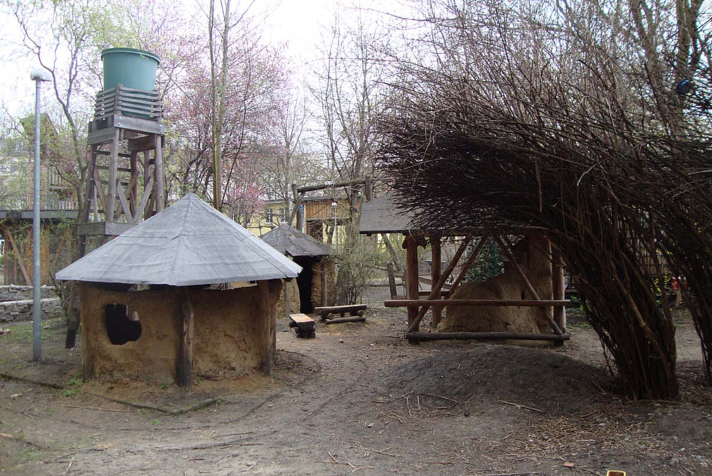 Vorbei am Bestandsgebäude geht es über den neu gepflasterten Weg zum Abenteuerspielplatz und Garten